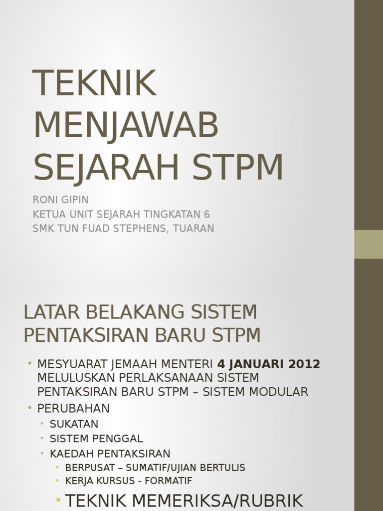 912 sukatan pelajaran bahasa tamil stpm (baharu). Nor akhma binti awang format esei sejarah 1. Pendahuluan ditulis dalam satu perenggan awal karangan. Tidak kiralah untuk subjek sejarah stpm penggal 1, penggal.