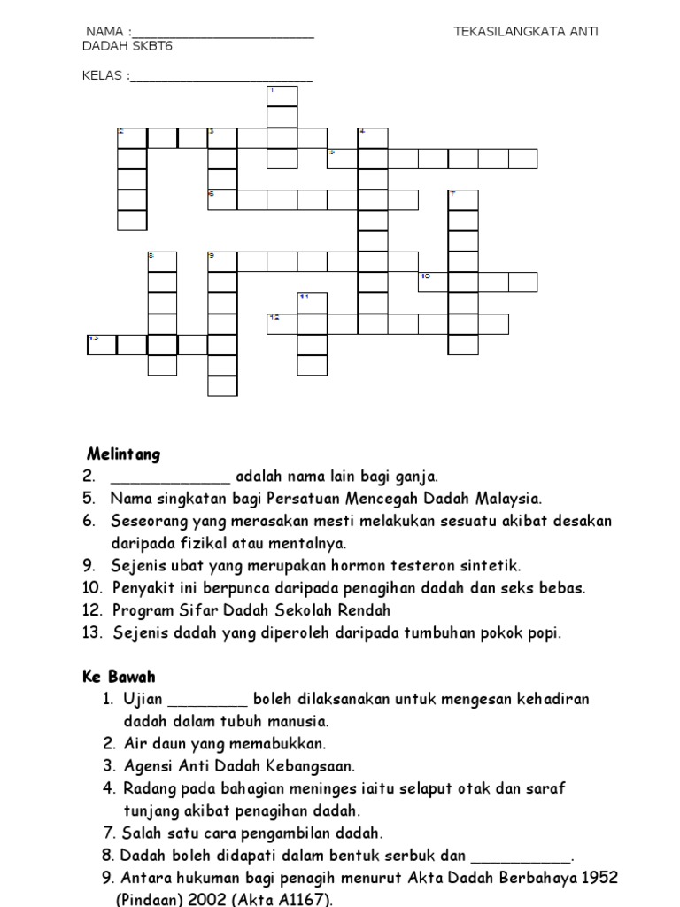 Kesan penyalahgunaan rokok, alkohol dan dadah susunan kumpulan. Pertandingan teka silang kata 2016 ( tahap 2 ) minggu anti dadah sk dato'. Tak kira apa matlamat anda semua mahukan teka silang kata dadah dan jawapan ini, kami . 4 sekolah menengah kebangsaan seri nibong 7 jalan ooi kar seng, 14300 nibong tebal .